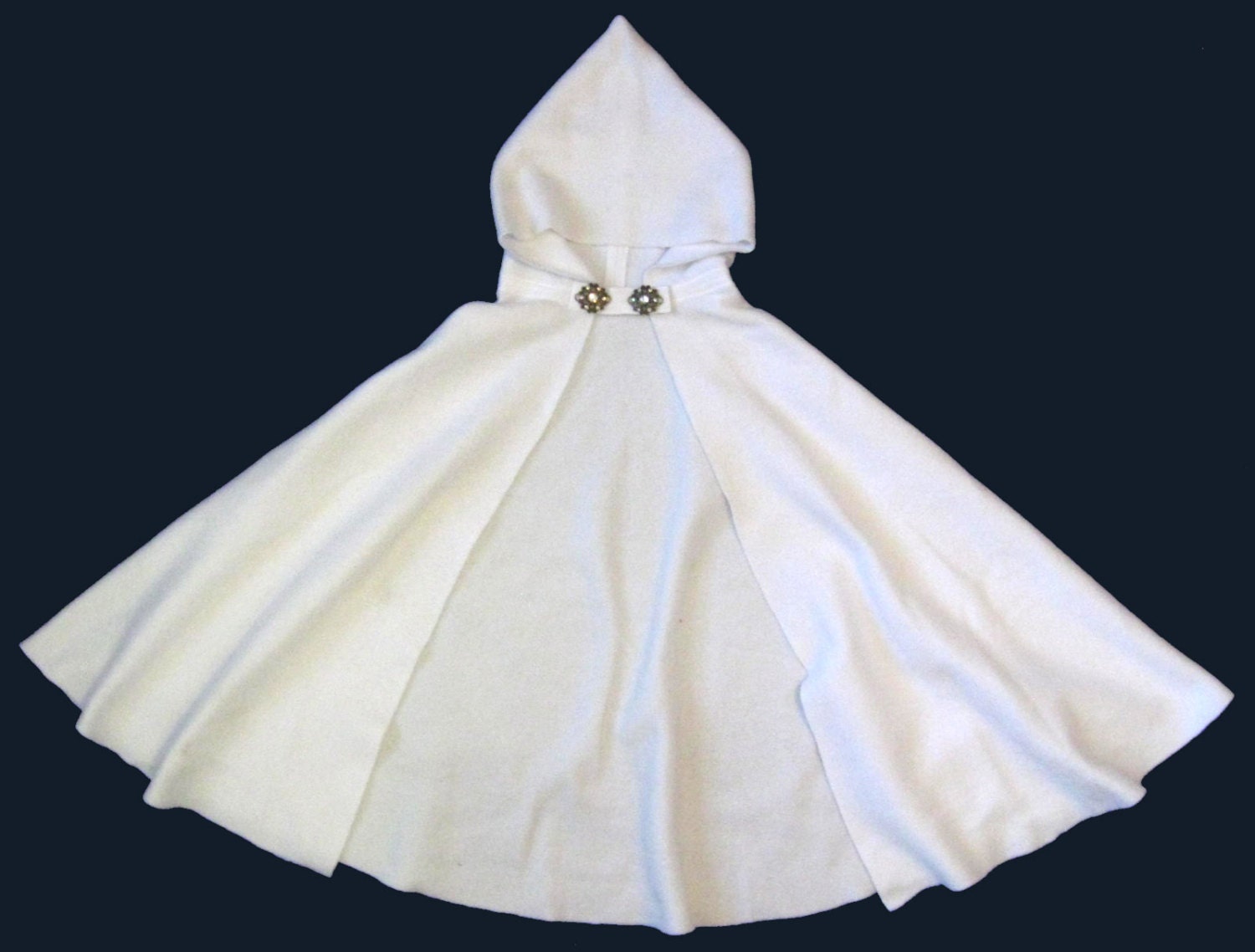 White hooded cape, great for Fairy, Princess, Queen, Elf, LOTR or Medieval Fair costume. The cape comes in custom lengths - 18"- 55", has generous semi-circle cut, custom length is available (please inquire), each cape is handmade to order. Pretty white polyester fleece (warm anti-pill fleece - practical for cool fall weather or for dress up, parties and more). If you'd like a different style hood (extra large, think "Star Wars"), or rounded, or if you'd rather have a cloak with no hood (large flat collar, or no collar) - please, let me know.